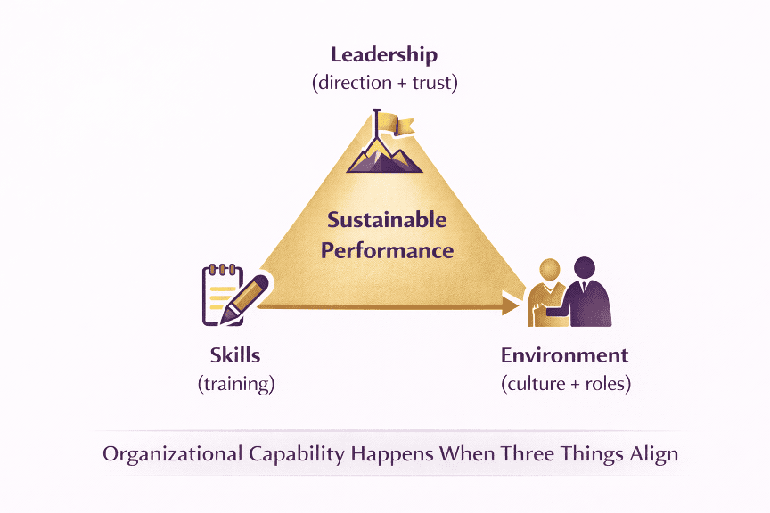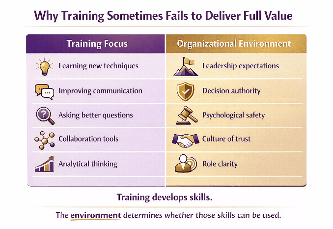 Training can introduce powerful techniques and practical tools. But if the surrounding culture and leadership expectations don’t support those behaviors, the value of the training can stall before it ever reaches real impact.